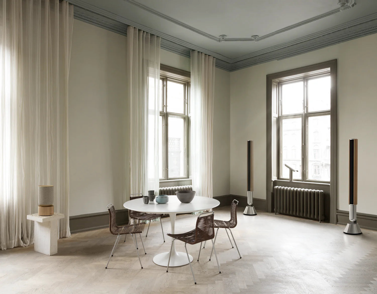Dies führte zum fünfeckigen Säulendesign des Beolab Penta – ein für Wohnzimmerlautsprecher völlig neues Design, das nicht nur durch die Platzierung der Treibereinheiten (die den Klang auf den Hörer fokussiert), sondern auch durch das fünfeckige Gehäuse stehende Wellen und Vibrationen im Inneren des Gehäuses reduziert.